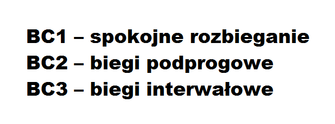 Dość wyczerpująca jednostka treningowa, która pozwala wejść zawodnikowi na tempa startowe. Pomaga również przyzwyczajać się do dużego wysiłku takiego jak na zawodach. Wykonuje się ją na 80%-90% swojego HRmax. Powiem szczerze, że nawet do 95% w warunkach letnich, gdy jest bardzo ciepło. Trening ten wykonuje się również w formie ciągłej jak i w formie krótkich odcinków. Cały trening biega się według określonego planu. Nie ma samowolki przy tak wysokiej inwensywności. Obowiązkowa rozgrzewka przed - poprzedzająca BC1 + odpowiednie ćwiczenia.