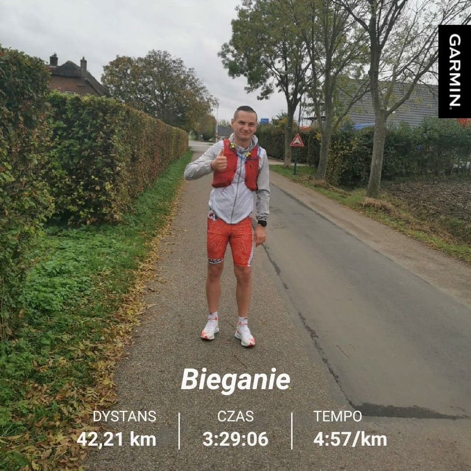 Po stosunkowo krótkim stażu biegowym niecałe dwa lata wywalczył czas poniżej 3 godzin i 30 minut.