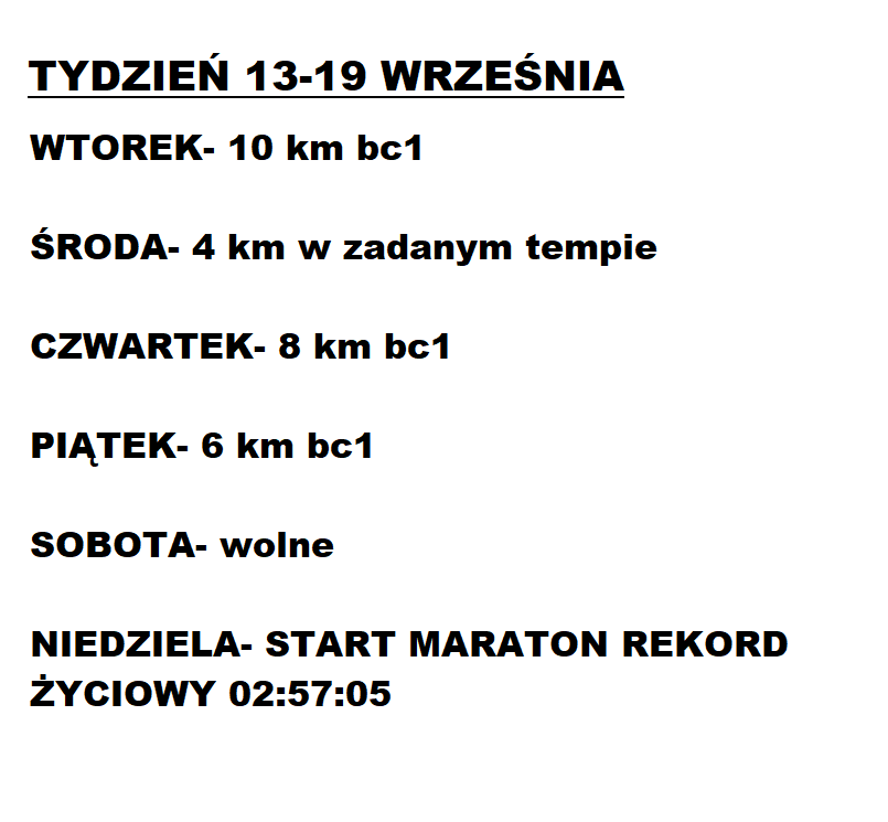 Mój zawodnik Wiesław we wrześniu 2021 pobiegł w Holandii maraton uzyskując wynik 02:57:05 - tempo 4'11". Bardzo utalentowany zawodnik do biegów długodystansowych, który wykonuje końską robotę. Bardzo dobrze reaguje na bodźce i ma świetne warunki fizyczne do biegania. Chciałbym Wam pokazać jak relatywnie prosty i skuteczny plan wykonywał dwa tygodnie przed startem.