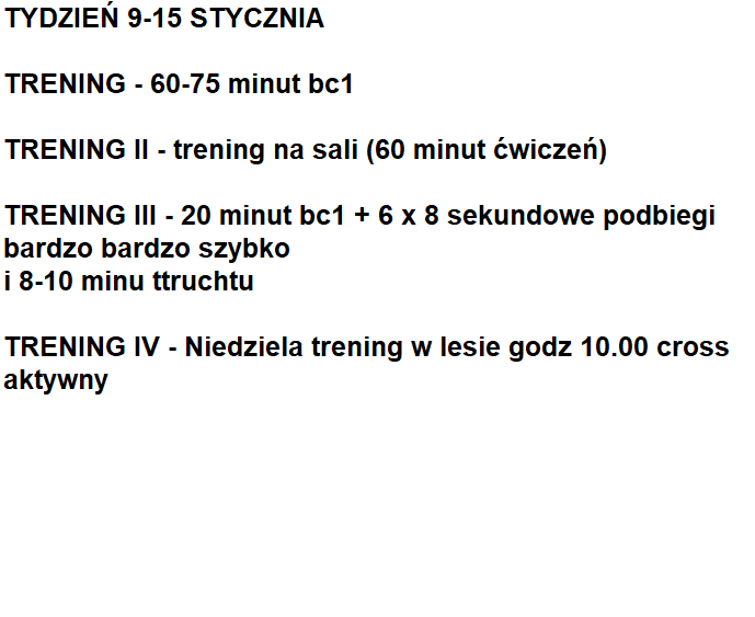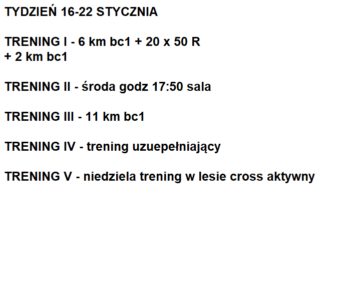 Poniższy plan treningowy jest dopasowany do indywidualnych predyspozycji zawdonika, oraz uwzględnia pracę i inne warunki, które mają wpływ na trening oraz wyniki.
