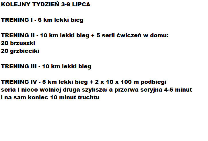 Poniższy plan treningowy jest dopasowany do indywidualnych predyspozycji zawdonika, oraz uwzględnia pracę i inne warunki, które mają wpływ na trening oraz wyniki.