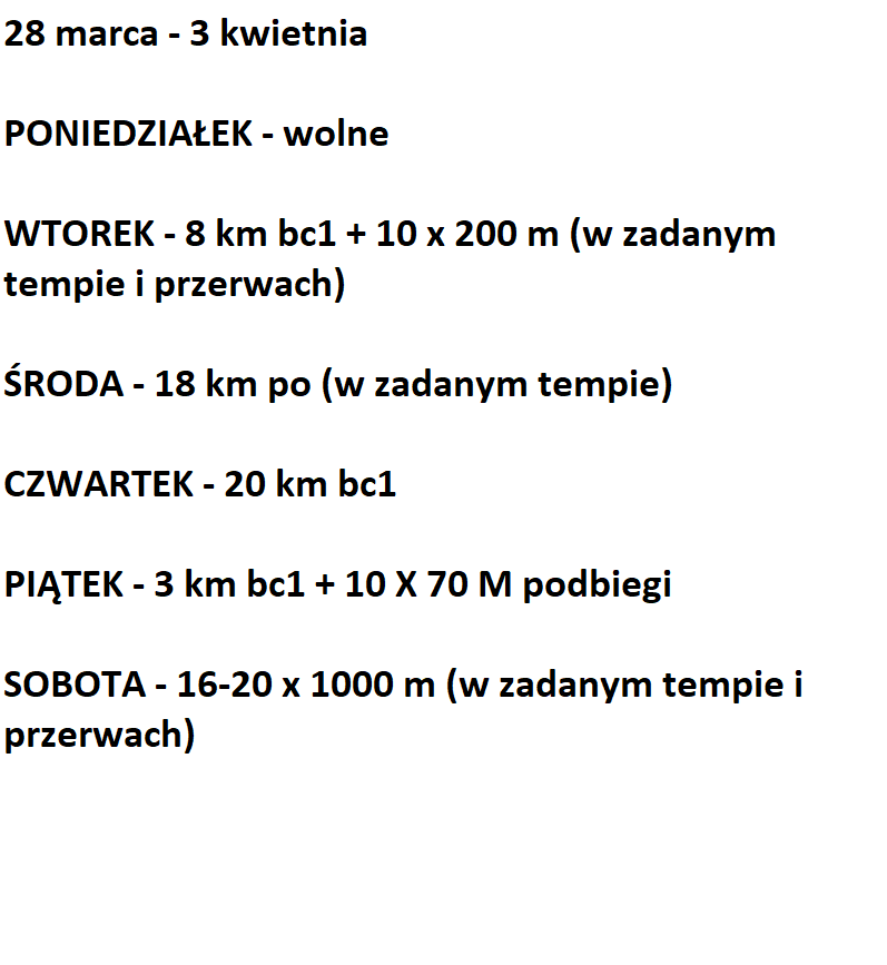 Oto dwu-tygodniowy plan treningowy zawodnika ambitnego, który konsekwetnie wykonywał polecenia trenera Marcina Witkowskiego