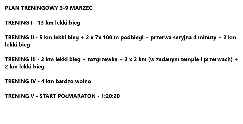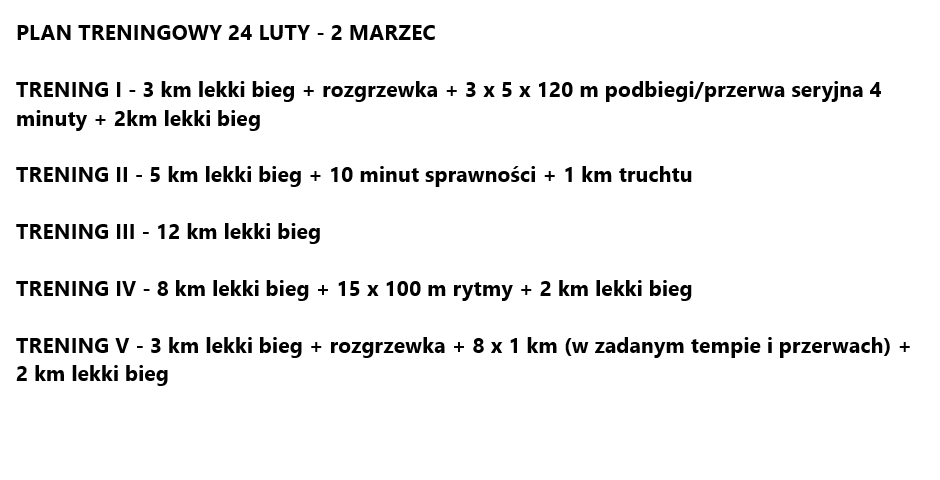 Poniższy plan treningowy jest dopasowany do indywidualnych predyspozycji zawodnika, oraz uwzględnia pracę i inne warunki, które mają wpływ na trening oraz wyniki.