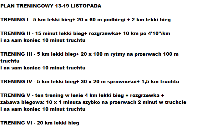 Poniższy plan treningowy jest dopasowany do indywidualnych predyspozycji zawdonika, oraz uwzględnia pracę i inne warunki, które mają wpływ na trening oraz wyniki.