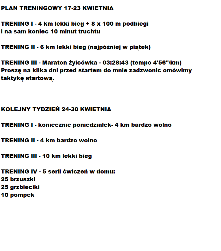 Poniższy plan treningowy jest dopasowany do indywidualnych predyspozycji zawdonika, oraz uwzględnia pracę i inne warunki, które mają wpływ na trening oraz wyniki.