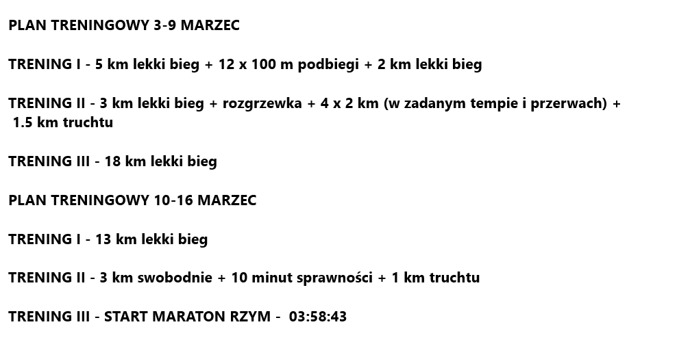 Poniższy plan treningowy jest dopasowany do indywidualnych predyspozycji zawodnika, oraz uwzględnia pracę i inne warunki, które mają wpływ na trening oraz wyniki.