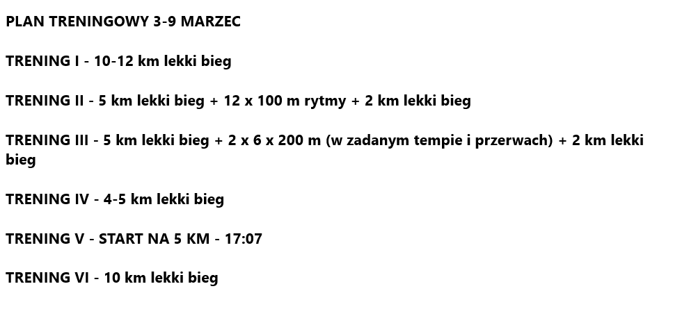 Poniższy plan treningowy jest dopasowany do indywidualnych predyspozycji zawodnika, oraz uwzględnia pracę i inne warunki, które mają wpływ na trening oraz wyniki.