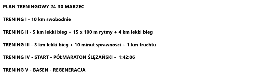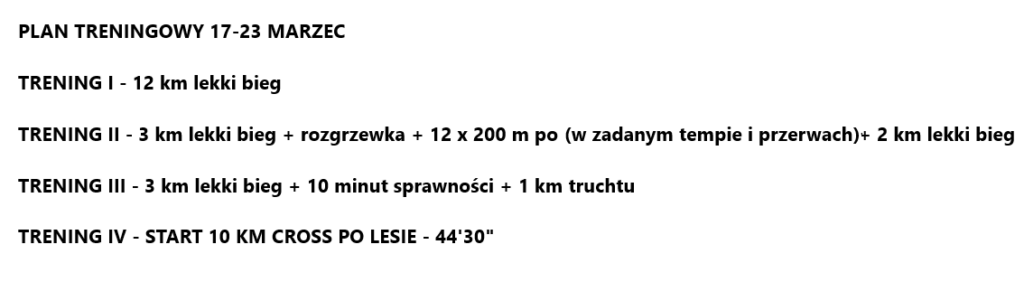 Poniższy plan treningowy jest dopasowany do indywidualnych predyspozycji zawodnika, oraz uwzględnia pracę i inne warunki, które mają wpływ na trening oraz wyniki.