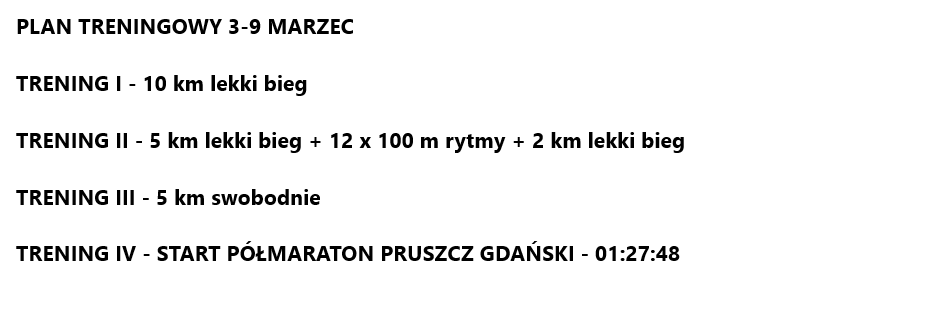 Poniższy plan treningowy jest dopasowany do indywidualnych predyspozycji zawodnika, oraz uwzględnia pracę i inne warunki, które mają wpływ na trening oraz wyniki.