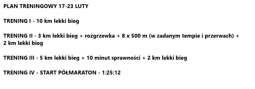 Poniższy plan treningowy jest dopasowany do indywidualnych predyspozycji zawodnika, oraz uwzględnia pracę i inne warunki, które mają wpływ na trening oraz wyniki.