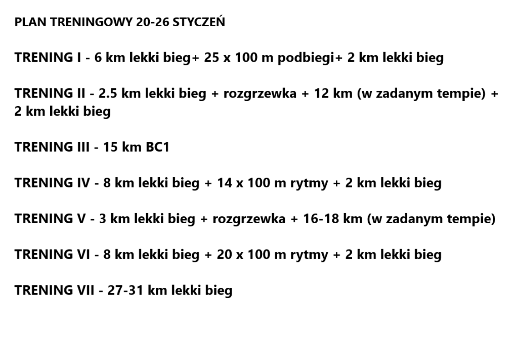 Poniższy plan treningowy jest dopasowany do indywidualnych predyspozycji zawodnika, oraz uwzględnia pracę i inne warunki, które mają wpływ na trening oraz wyniki.