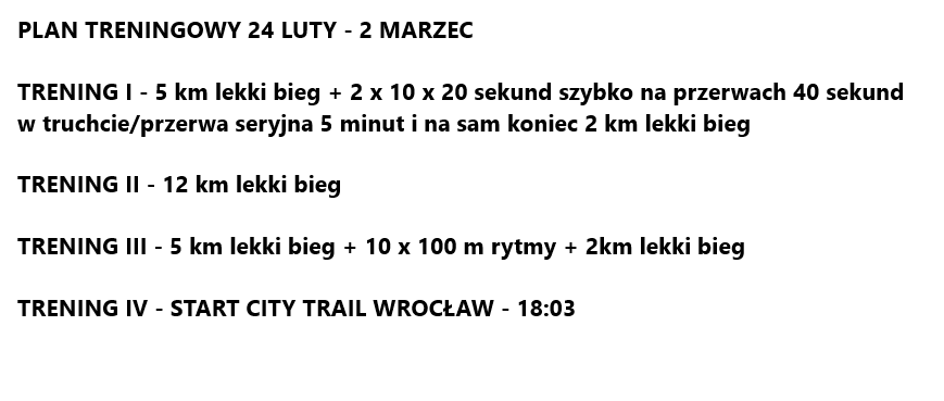 Poniższy plan treningowy jest dopasowany do indywidualnych predyspozycji zawodnika, oraz uwzględnia pracę i inne warunki, które mają wpływ na trening oraz wyniki.