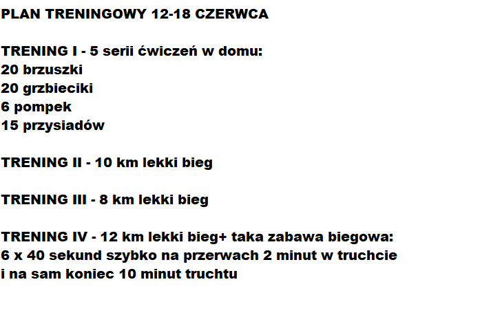 Poniższy plan treningowy jest dopasowany do indywidualnych predyspozycji zawdonika, oraz uwzględnia pracę i inne warunki, które mają wpływ na trening oraz wyniki.