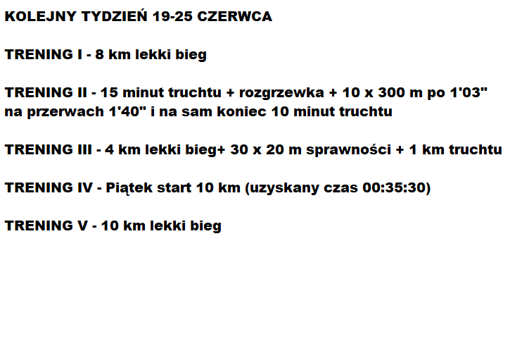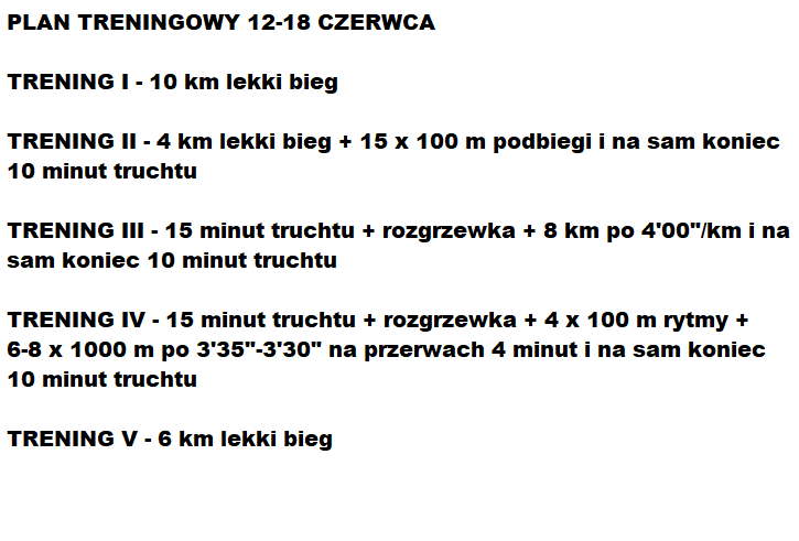 Poniższy plan treningowy jest dopasowany do indywidualnych predyspozycji zawdonika, oraz uwzględnia pracę i inne warunki, które mają wpływ na trening oraz wyniki.