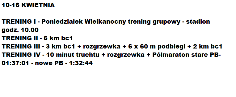 Mój podopieczny Bartek, z którym współpracuję kolejny sezon z rzędu poprawił tym razem swój rekord życiowy w Półmaratonie Żmigród o ponad 4 minuty (1:37:01 na 1:32:44). Możliwe, że rekord byłby bardziej wyśrubowany, gdyby zaczął troszkę mądrzej, ale wynik jaki osiągnął jest dużym progresem względem poprzedniego rekordu życiowego. Sumienna praca i jeszcze większa doza pokory, a będzie jeszcze lepiej u Bartka, bo to dopiero początki. Chciałbym Wam pokazać jego plan treningowy z trzech tygodni przed rekordowym startem.