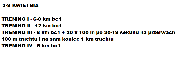 Poniższy plan treningowy jest dopasowany do indywidualnych predyspozycji zawdonika, oraz uwzględnia pracę i inne warunki, które mają wpływ na trening oraz wyniki.
