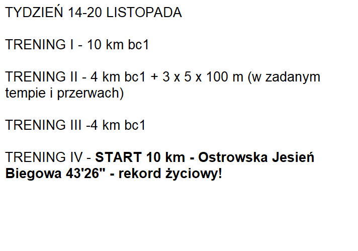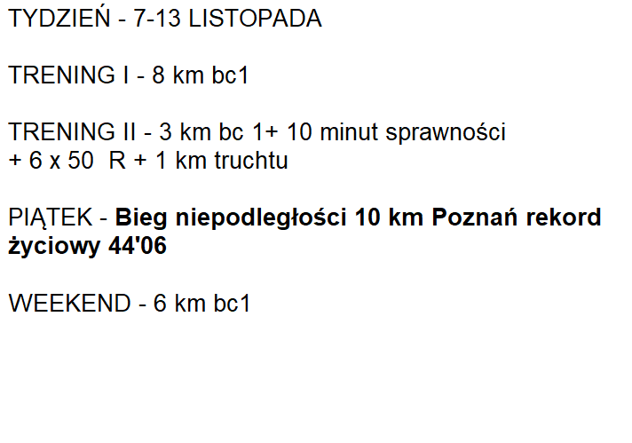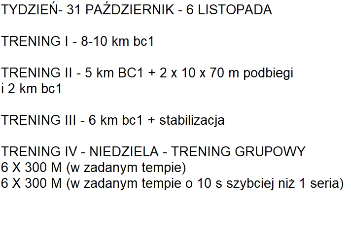 Poniższy plan treningowy jest dopasowany do indywidualnych predyspozycji zawdonika, oraz uwzględnia pracę i inne warunki, które mają wpływ na trening oraz wyniki.