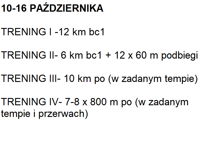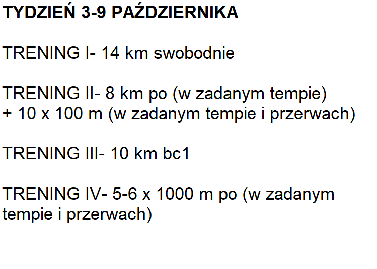 Poniższy plan treningowy jest dopasowany do indywidualnych predyspozycji zawdonika, oraz uwzględnia pracę i inne warunki, które mają wpływ na trening i wyniki.