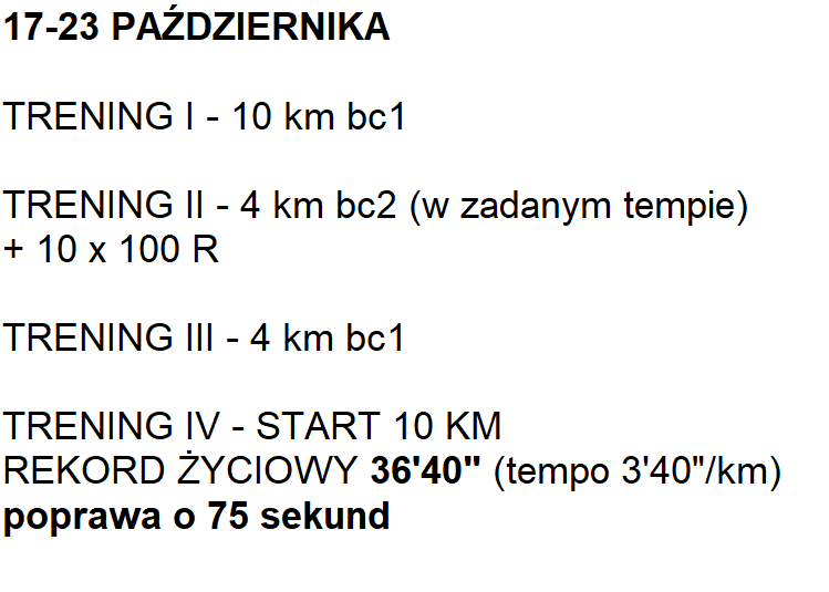 Chciałbym Waw pokazać co trenował mój zawodnik Norbert trzy tygodnie przed startem w Kole na 10 km 23 października 2022. Owy podopieczny cechuje się dokładnością, starannością oraz systematycznym treningiem pod moim bacznym okiem od dwóch sezonów. Norbert (PB 10 km 36:40) przed każdym startem kontaktuje się ze mną i ustalamy wspólnie taktykę na dany bieg. Świetnie mi się z nim współpracuje. Efekty widać... a z resztą poprawa na 10 km o 75 sekund mówi sama za siebie. A jak wiemy poprawianie wyników na tym poziomie nie należy do łatwych zadań. Trzeba wiedzieć jak to robić, aby się udawało robić ciągły progres. W dużej mierze wszystko zależy od zawodnika, czy będzie skrupulatnie wykonywać treningi, czy lecieć w kulki, aby dokładać sobie bez wiedzy trenera dodatkowych obciążeń.