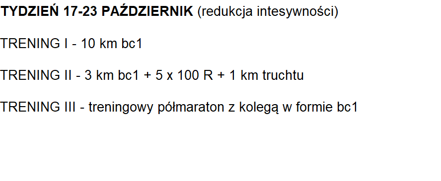 Poniższy plan treningowy jest dopasowany do indywidualnych predyspozycji zawdonika, oraz uwzględnia pracę i inne warunki, które mają wpływ na trening oraz wyniki.