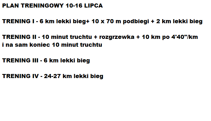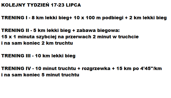 Poniższy plan treningowy jest dopasowany do indywidualnych predyspozycji zawdonika, oraz uwzględnia pracę i inne warunki, które mają wpływ na trening oraz wyniki.