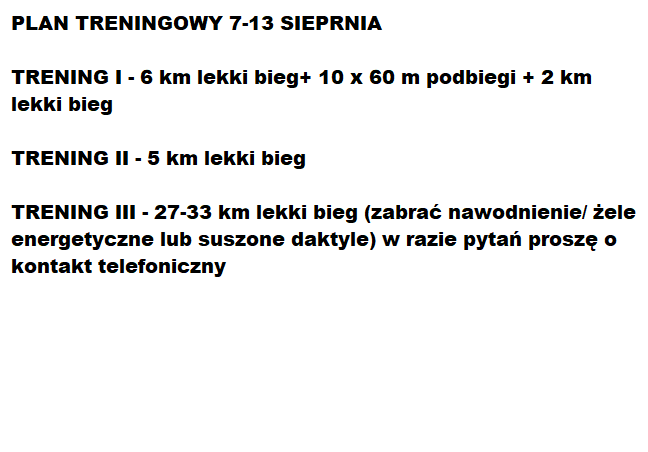 Poniższy plan treningowy jest dopasowany do indywidualnych predyspozycji zawdonika, oraz uwzględnia pracę i inne warunki, które mają wpływ na trening oraz wyniki.