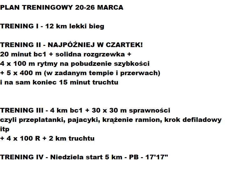 Mój pewien podopieczny, który ma 51 lat przygotowywuje się do startów w 2023 roku. Biega na bardzo dobrym poziomie. Jego rekord życiowy na 5 km to 17'17". Chciałbym Wam pokazać jego tygodniowy plan treningowy z tygodnia 20-26 marca.