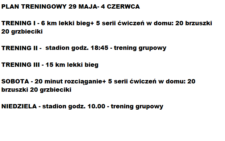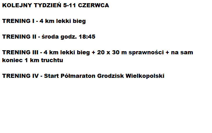 Poniższy plan treningowy jest dopasowany do indywidualnych predyspozycji zawdonika, oraz uwzględnia pracę i inne warunki, które mają wpływ na trening oraz wyniki.