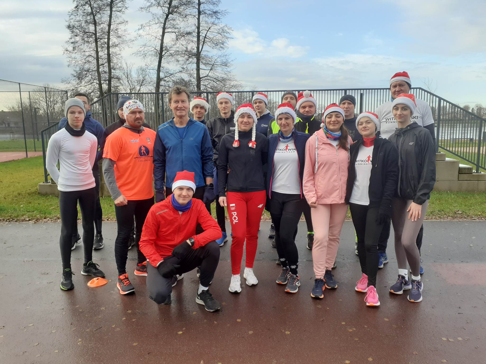Dziś wykonaliśmy specjalny świąteczny trening grupowy. Mieliśmy nawet gości z Poznania. Wykonaliśmy rozgrzewkę w formie truchtu, a następnie ćwiczenia dynamiczne jak i statyczne. Potem zrobiliśmy 4 przebieżki po około 60 m na naturalnej nawierzchni. Po tym wstępie przeszliśmy do części zasadniczej, czyli do biegu ciągłego w odpowiednio dopasowanym tempie dla każdego wg. wytrenowania. Były 3 grupy. Na sam koniec schłodziliśmy się 10-minutowym truchtem.