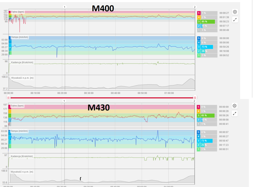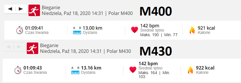 Finalnie pomiary tętna wyszły identyczne, jeśli patrzyłoby się na średnie tętno. Pomiar dystansu niestety się różni jak i średnie tempo.